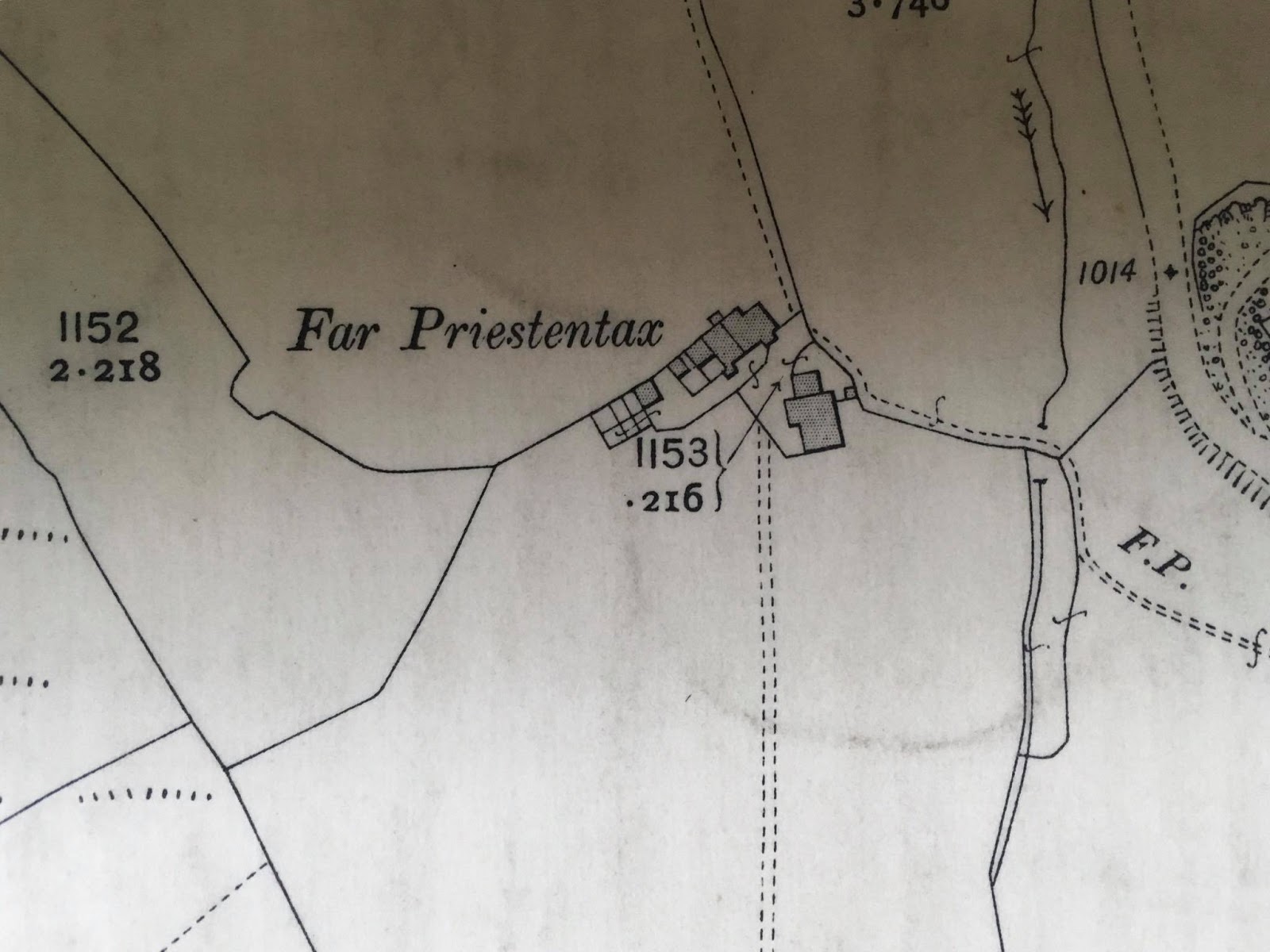 From much later map evidence eg: 1893 OS 1:2500. It shows the farm Priestentax consisted of - Two buildings and outbuildings enclosed in a large farmyard; one is two conjoined buildings, one with an internal division, forming irregular rectangle with appendages 75'x35/25', probably farmhouse and cottage; and the other a rectangular barn of 70'x50'.